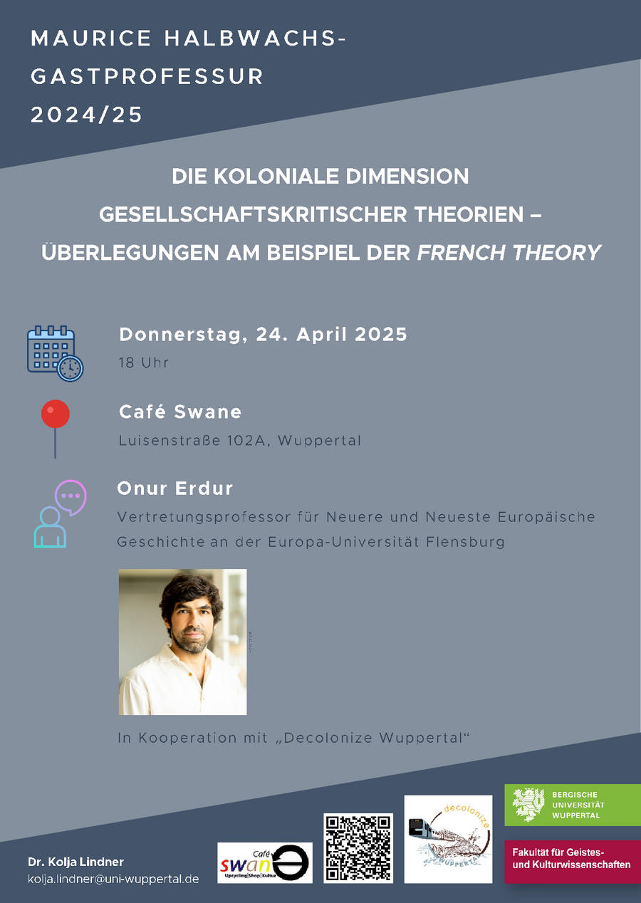 Vortrag von und Diskussion mit Onur Erdur (wissenschaftlicher Mitarbeiter für Kulturwissenschaft an der Humboldt-Universität zu Berlin und im Sommersemester 2025 Vertretungsprofessor für Neuere und Neueste Europäische Geschichte an der Europa-Universität Flensburg). Er ist u. a. Autor von Schule des Südens. Die kolonialen Wurzeln der französischen Theorie (2024) und Die epistemologischen Jahre. Philosophie und Biologie in Frankreich, 1960-1980 (2018). Die Veranstaltung erfolgt in Kooperation mit Decolonize Wuppertal.