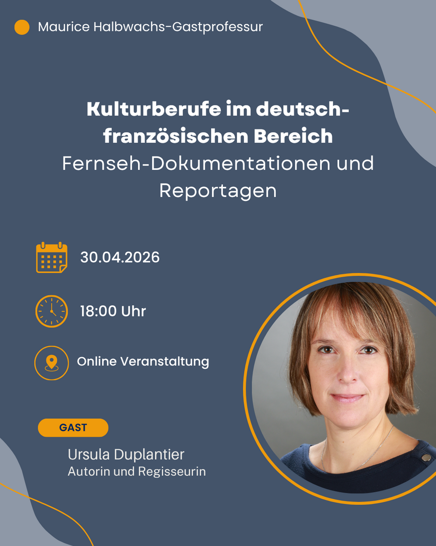 Im Rahmen der Reihe „Kulturberufe im deutsch-französischen Bereich“ stellt Ursula Duplantier neben ihrem persönlichen Werdegang zur deutsch-französischen Journalistin und Regisseurin auch die Anforderungen und Herausforderungen vor, die heute mit einer Tätigkeit in der Medienbranche verbunden sind. Außerdem erläutert sie die Funktionsweise des Senders ARTE und zeigt, wie grenzüberschreitende Zusammenarbeit im journalistischen Alltag funktioniert.