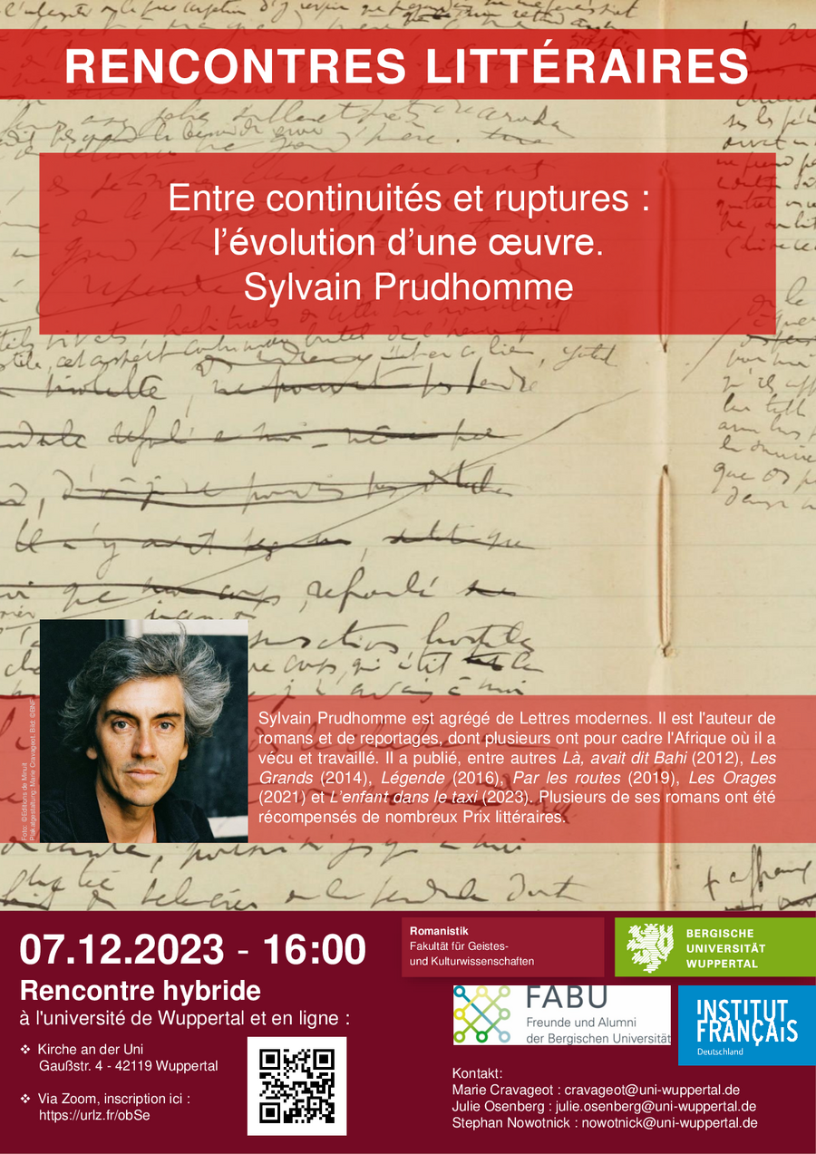 Am 07.12.2023 findet die nächste Rencontre Littéraire von 16 bis 18 Uhr in der Kirche an der Uni statt. Zu Gast wird dieses Mal der erfolgreiche Schriftsteller Sylvain Prudhomme sein, den wir nach einer ersten Veranstaltung im Juli 2021 nun bereits zum zweiten Mal in Wuppertal begrüßen dürfen. Der Schriftsteller wird uns bei dieser Rencontre Einblicke in die Entwicklung (s)eines literarischen Werkes geben.