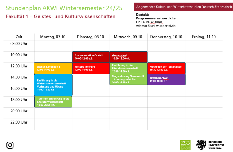 Damit Sie sich einen ersten Eindruck verschaffen können, finden Sie hier einen Beispielstundenplan aus dem Wintersemester 2024/25.